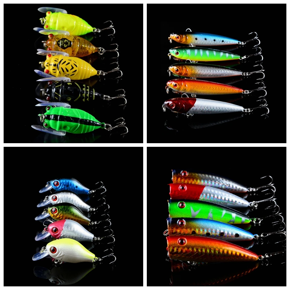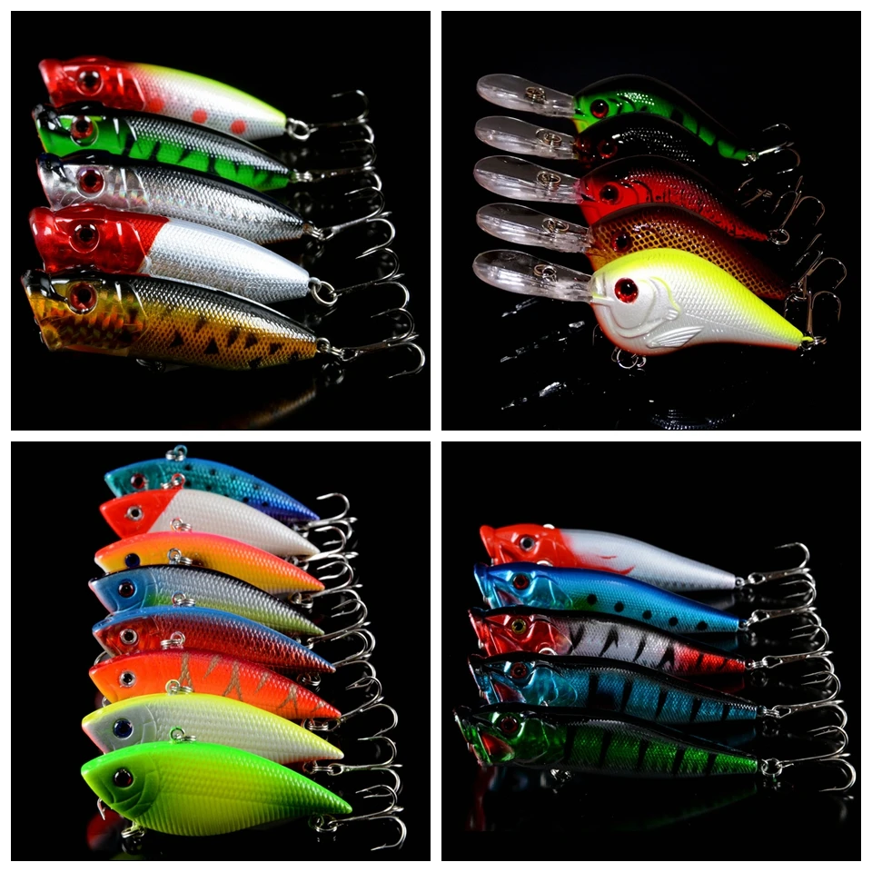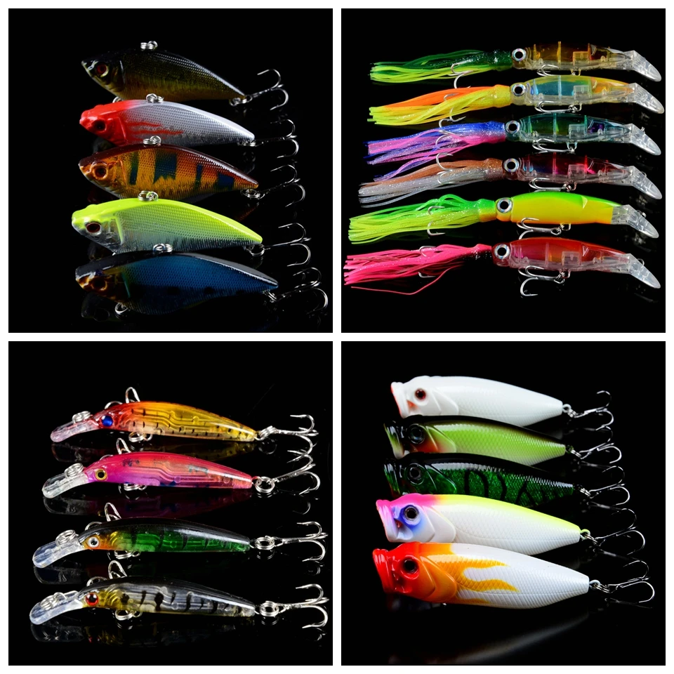 Skup Tanie 83 sztuk partia Przynęty Set Mieszane 16 Varisized Styl Wobblers przynętę Minnow Korba VIB Poper oł oacute;wek i Squid lure mieszane Ceny.