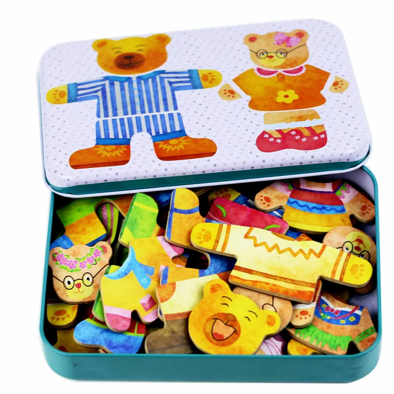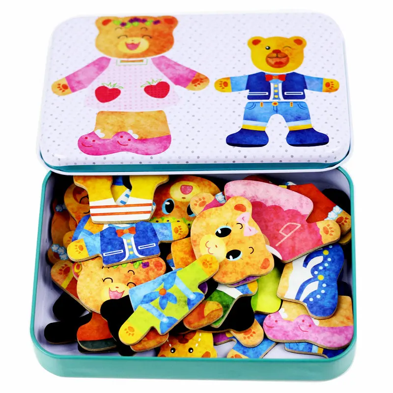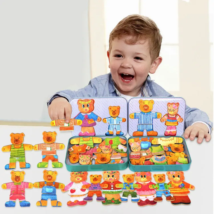 Skup Tanie Dzieci Żelaza pole magnetyczne drewna niedźwiedź zmiana ubrania, dwa niedźwiedzie zmiana jigsaw puzzle, inteligencję dzieci drewniane Puzzle zabawki Cena